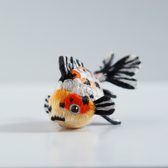 ころころまぁるいフォルムの「手毬金魚」 通常サイズより小さくしたおチビさんです。 こちらはリュウキンモデルの中でも、着物のような柄を持つモダンな金魚です。 三色金魚(キャリコ)をお客様からご要望いただき、色を散らすように縫ったことと三色の音を組み合わせて「散色…サンショク」と名づけました。 目以外すべて、パーツ製作から組み上げまで一本取りの刺繍で縫い上げています。 目として使用しているパーツの接着以外には、接着剤は使用しておりません。 造花を散らしたガラス瓶の中に泳がせてお届けします。 ガラス瓶は厚みがあり頑丈なものですが、小さなお子様や動物と暮らしているお家では置場所にご注意ください。 *** 【使用素材】 刺繍糸、布、綿、針金、ラインストーン ◎サイズ 金魚本体 全長…頭から尻尾まで約4.5㎝ 横幅…手ビレから手ビレまで約2.5㎝ 縦…背ビレから腹ビレまで約3.5㎝ ボトル…タテ7㎝×ヨコ約6㎝ (球体状のガラス瓶です) ※すべて手作業のため、色柄表情に個体差があります。 ※ご使用の媒体によって、見える色に違いが出る場合があります。 ※ワイヤーを使用しているためヒレの形を変えることができますが、その動作によって刺繍がよれたり浮いてしまう可能性があるので、身につける際の微調整に留めてください。 【配送について】 匿名配送を利用します。 お届けの際、発送元の表示はBASEとなります。 *転売目的でのご購入をお断りしております。 *当店のテキスト・画像の無断転載・複製を固く禁じます。 Prohibits purchase for resale. Unauthorized copying and replication of the contents of this shop, text and images are strictly prohibited.